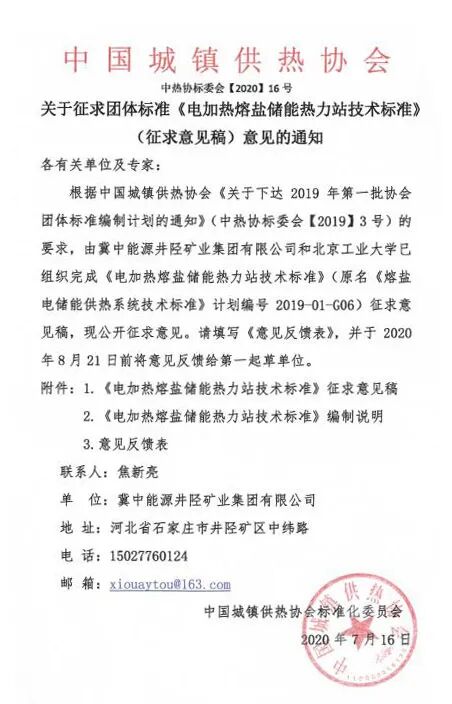 井矿集团发布《电加热熔盐储能热力站技术标准》征求意见稿